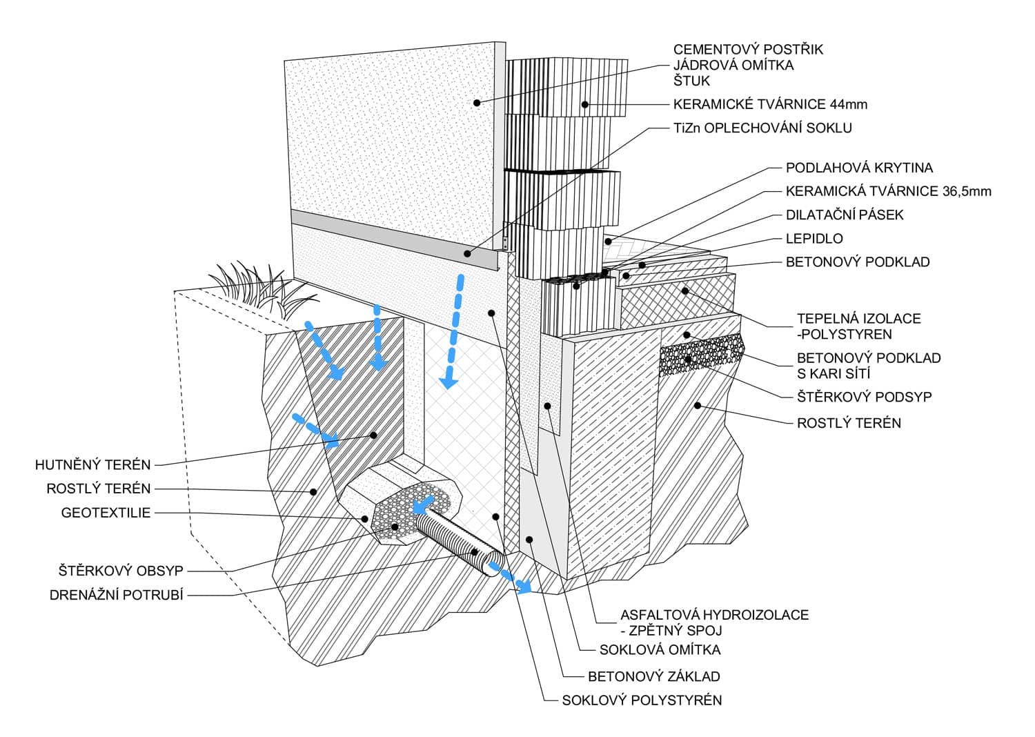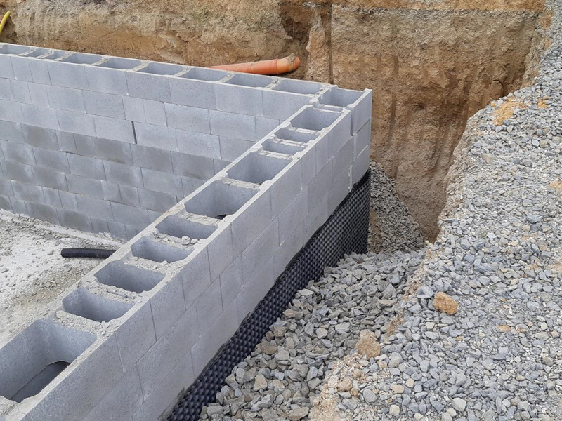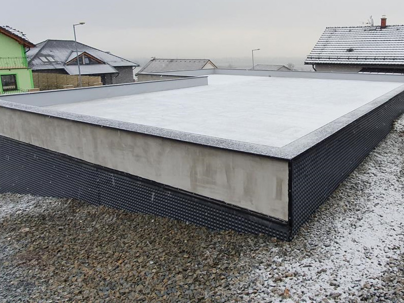 Prvá vrstva štrku sa vždy dáva hrubšia a umiestni sa na pripravenú geotextíliu. Na túto vrstvu sa umiestni drenážna rúra v spáde a tú potom obsypete jemnejším štrkom. Na základ domu upevníte nopovú fóliu proti vzlínajúcej vlhkosti do domu.
