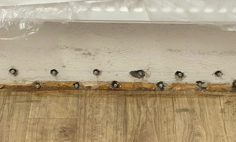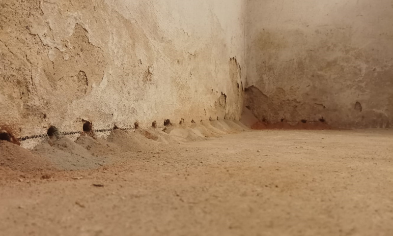 - Vŕtanie otvorov – Do muriva sa vyvŕtajú malé otvory, čo sa obvykle vykonáva v rade po celej dĺžke postihnutej steny. Samozrejme, záleží na type sanácie, podľa toho sa volí technologický plán vrtov. Nie je neobvyklé, že ide niekedy aj o typ sanačného materiálu, pretože každý môže vyžadovať iný typ rozloženia vrtov v rámci toho, ako dokáže prestupovať stenou.